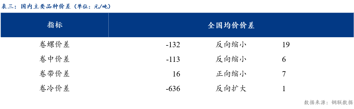 从品种价差来看,卷螺差较上一交易日反向缩小19元/吨,热中价差较上一交易日反向缩小6元/吨,热带价差较上一交易日正向缩小7元/吨,热冷价差较上一交易日反向扩大1元/吨。