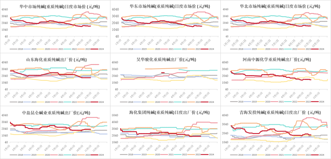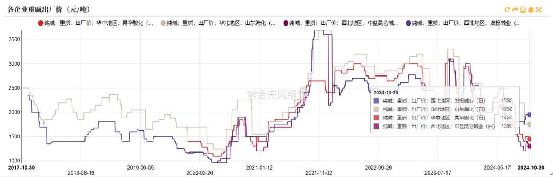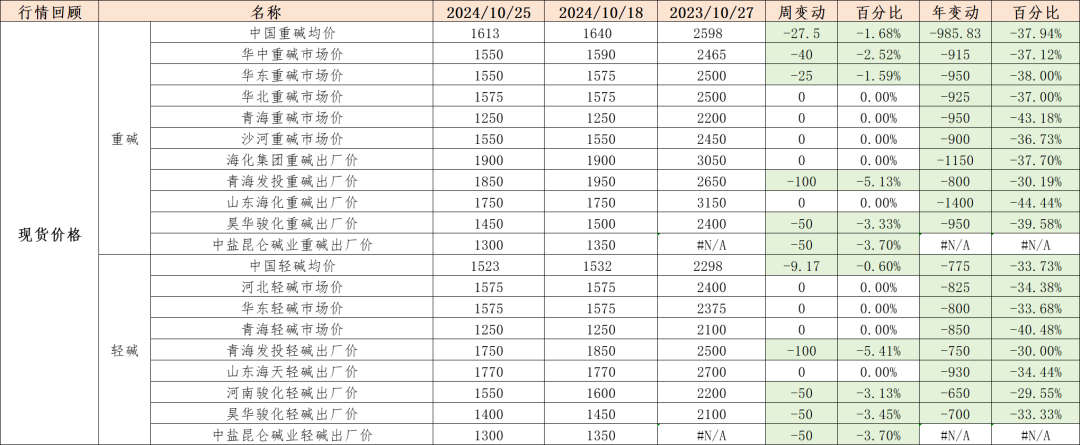 截至2024年10月25日,本周重碱现货市场重心下移,成交不温不火。中国重碱均价为1613元/吨,较10月18日-27.5元/吨(环比-1.68%),较去年同期-985.83元/吨(同比-37.94%);华北地区重碱市场价为1575元/吨,较上周环比持平,较去年同期-925元/吨(同比-37%) ;青海地区重碱市场价为1250元/吨,较上周环比持平,较去年同期-950元/吨(同比-43.18%)。