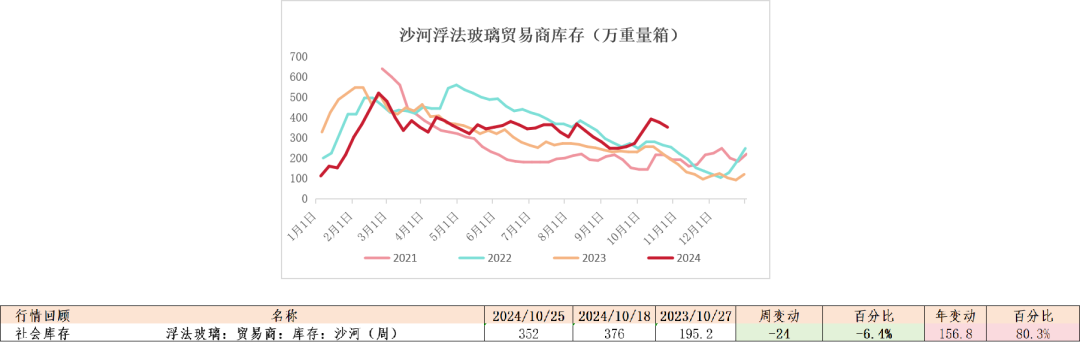 截至2024年10月25日,沙河浮法玻璃贸易商库存为352万重量箱,较10月18日-376万重箱(环比-6.4%),年变动+156.8万重量箱(同比+80.3%)