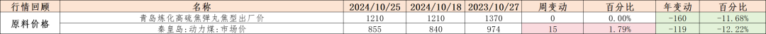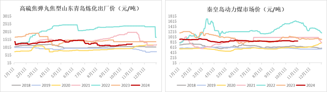 截至2024年10月25日,高硫焦弹丸焦型山东青岛炼化出厂价为1210元/吨,较去年同期-160元/吨(同比-11.68%);秦皇岛动力煤市场价格为855元/吨,较上周+15元/吨(环比+1.79%),较去年同期-119元/吨(同比+12.22%)。