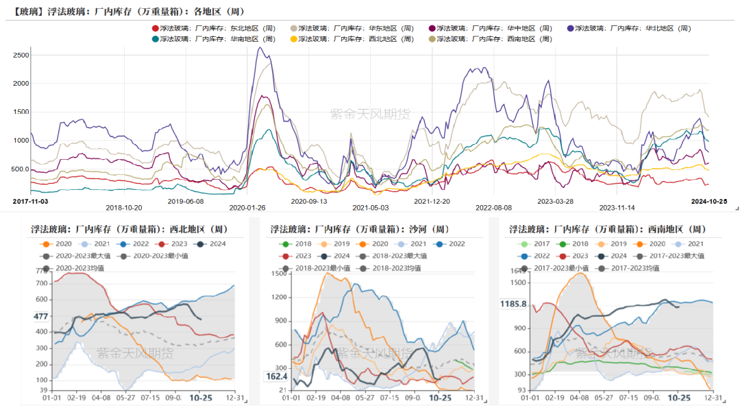 核心观点:中性 本周玻璃期货价格大幅上涨,截至2024年10月25日,FG2501收盘价格为1349元/吨,较10月18日+119元/吨(环比+9.7%);同期较2023年10月27日年变动-280,同比-17.2%。供应端,产量较上周变动不大,关注后续的检修及点火计划;需求端,房地产行业整体仍处于低迷状态,玻璃深加工订单同比下降,汽车行业产销较好,拉动玻璃需求;库存端,本周本周浮法玻璃整体去库,华中地区小幅累库。