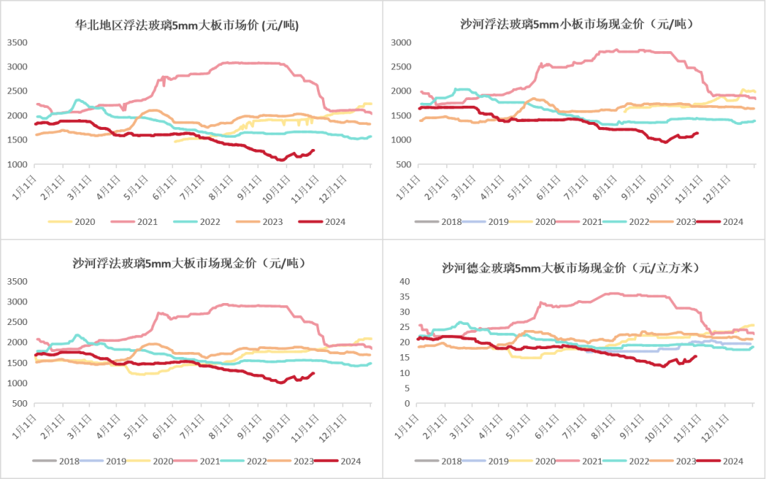 截至2024年10月25日,本周浮法玻璃现货市场成交重心小幅走高。其中沙河地区涨多跌少,整体出货情况良好,上半周厂家出货一般,后续市场情绪带动下,价格上涨。周边地区深加工订单较好,期现商少量提货,下游按需采购,玻璃厂小幅去库;华中地区本周稳价出货,中下游采购积极性不高,部分厂外发到沙河地区。截至2024年10月25日,河北润安浮法玻璃5mm大板出厂价为1140元/吨,较上周+20元/吨(环比+1.79%),较去年同期-800元/吨(同比-41.24%);华中地区浮法玻璃5mm大板市场价为1150元/吨,较上周+20元/吨(环比+1.77%),较去年同期-880元/吨(同比-43.35%)。