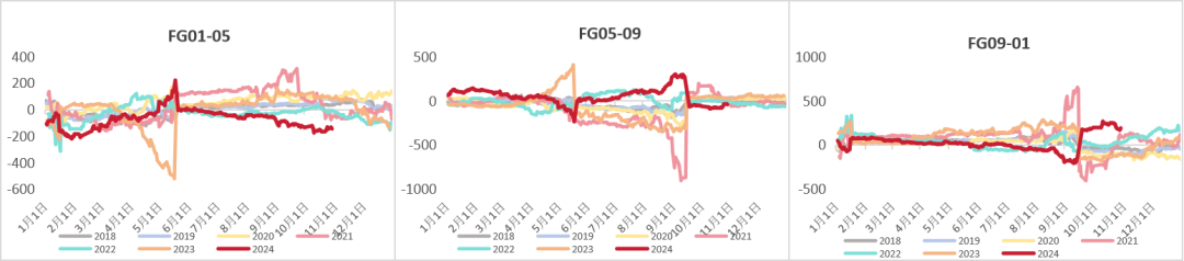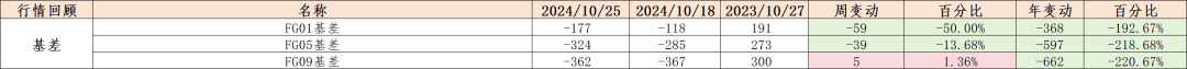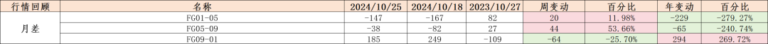 截至2024年10月25日,本周FG01-05月差小幅缩小,FG01-05价差为-147元/吨,周变动+20(环比+11.98%),年变动-229(同比-279.27%);FG05-09价差为-38元/吨,周变动+44(环比+53.66%),年变动-65(同比-240.74%);FG09-01价差为185,周变动-64(环比-25.7%),年变动+294(同比+269.72%)。