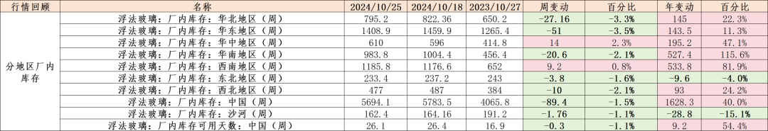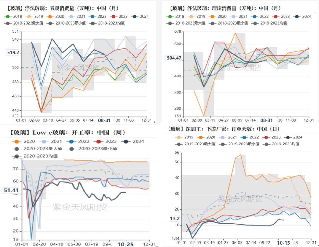 供应:中性 截至2024年10月24日,浮法玻璃供应端本周变化不大,日产量为16.219万吨,较10月17日环比持平;浮法玻璃日产能利用率为80.525%,较10月17日环比持平;浮法玻璃企业冷修日损失量为 39225 吨/日,环比 17 日持平。本周全国浮法玻璃损失量 27.46 万吨,环比+0.22%。根据隆众资讯,国内玻璃生产线在剔除僵尸产线后共计 298 条,其中在产 234 条,冷修停产 64 条。浮法玻璃开工率为78.52%,较10月18日周变动+0.2829%,年变动-3.56%。