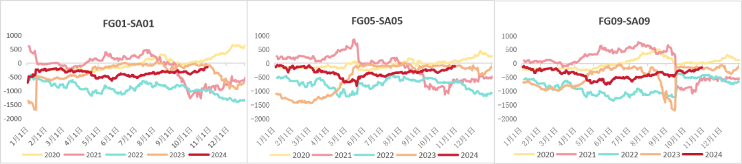 本周玻璃和纯碱盘面价差环比缩小。截至2024年10月25日,FG01-SA01价差为-169,较上周+51,涨幅23.18%,较去年同期-110,跌幅186.44%;FG05-SA05为-110,较上周+67,涨幅37.85%,较去年同期-18,跌幅19.57%;FG09-SA09为-165,较上周+55,涨幅25%,较去年同期-7,跌幅4.43%。