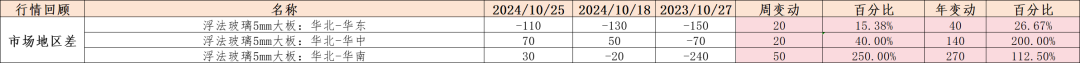 截至2024年10月25日,浮法玻璃5mm大板:华北-华东价差缩小为-110元/吨,周变动+20元/吨(环比+15.38%),年变动+40元/吨;浮法玻璃5mm大板:华北-华中价差扩大为70元/吨,周变动+20元/吨,年变动+140元/吨0;浮法玻璃5mm大板:华北-华南价差扩大为30元/吨,周变动+50元/吨,年变动+270元/吨.