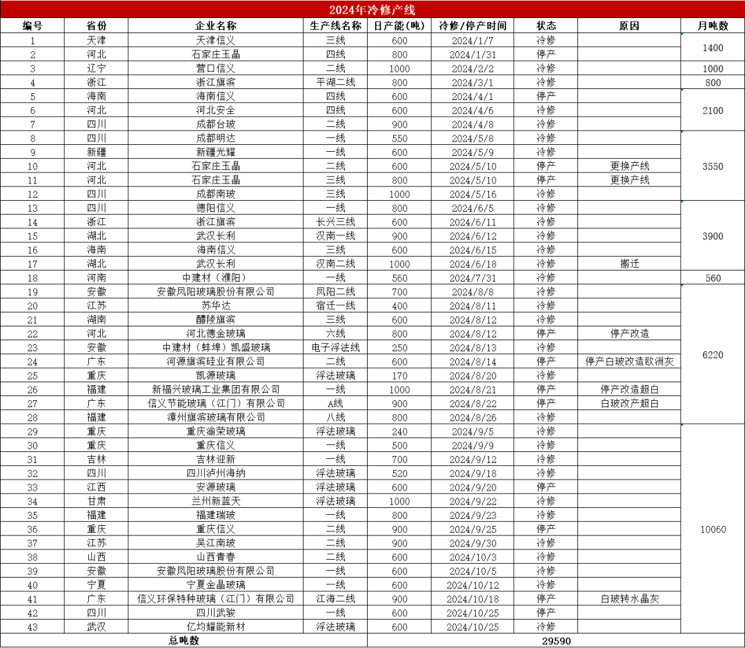 截至2024年10月24日,光伏玻璃在产日熔量 95976 吨/日,环比上周-0.93%;国内光伏玻璃企业冷修损失量 28720 吨/日;