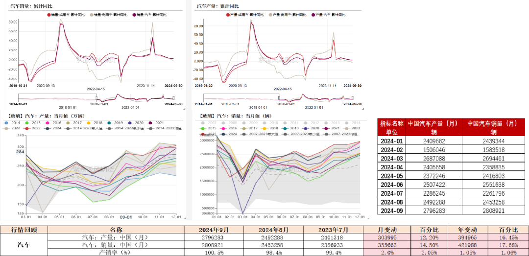 需求:中性偏空 房地产行业整体仍处于低迷状态,根据统计局数据,2024年9月房屋销售面积、新开工面积、施工面积、竣工面积同比分别为-10.82%,-20%,-29.4%,以及-31.26%。房地产9月竣工面积降幅较大,玻璃深加工订单减少,后期持续关注房地产政策落地情况。截至2024年9月30日,中国汽车产量279.6万辆,较8月环比+12.2%,较去年同比+16.45%。 受到“两新”政策刺激,汽车行业产销率表现良好,较8月环比+2.05%。