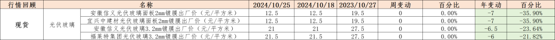 截至2024年10月25日,本周光伏玻璃现货价格主流报价较稳定,环比持平,较去年大幅下降。安徽信义光伏玻璃2mm镀膜出厂价较去年-7元/立方米(同比-35.9%),宜兴中建材光伏玻璃面板2mm镀膜出厂价较去年-7元/立方米(同比-35.9%%),安徽信义光伏玻璃3.2mm镀膜出厂价较去年-6.5元/立方米(同比-23.64%),福莱特集团光伏玻璃3.2mm镀膜出厂价较去年-6元/立方米(同比-21.82%)