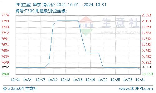 据生意社商品行情分析系统显示,10月PP市场行情涨后回落,各牌号产品价格水平基本跌回月初。截止10月31日,国内生产商、贸易商拉丝主流报盘价格在7585.71元/吨左右,较10月1日价格水平涨跌幅-0.09%。