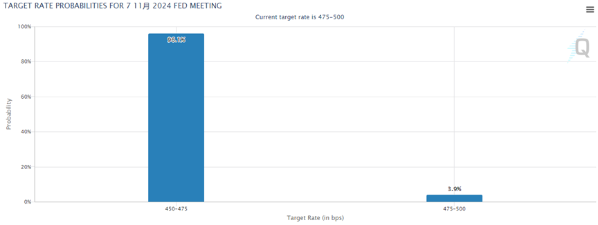 一系列数据的公布首先在资本市场有了体现,美股三大指数集体收跌,道指跌0.22%,纳指跌0.56%,标普500指数跌0.33%。而据芝加哥商品交易所的美联储观察工具显示:美联储到11月降25个基点的概率为96.1%,维持当前利率不变的概率为3.9%(数据公布前分别为99%和1%)。同时,美元指数在隔夜市场下降,当日早间一度由跌转涨,随后快速走低,尾盘时美元指数下跌。