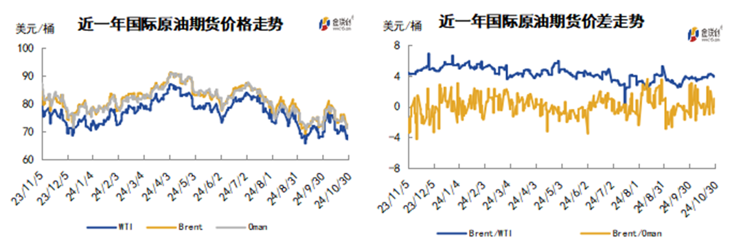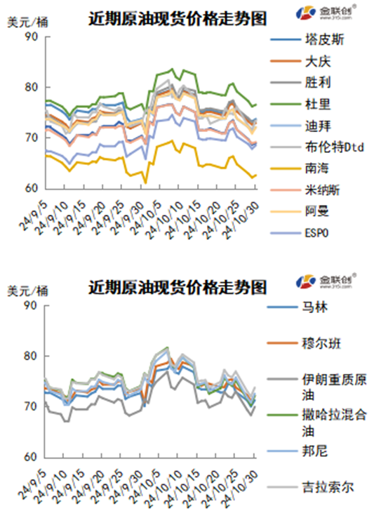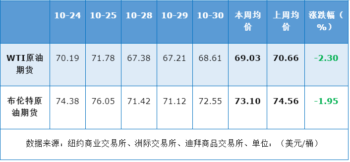 本周(10.24-10.30),原油整体呈现震荡下行的走势,均价环比下跌。