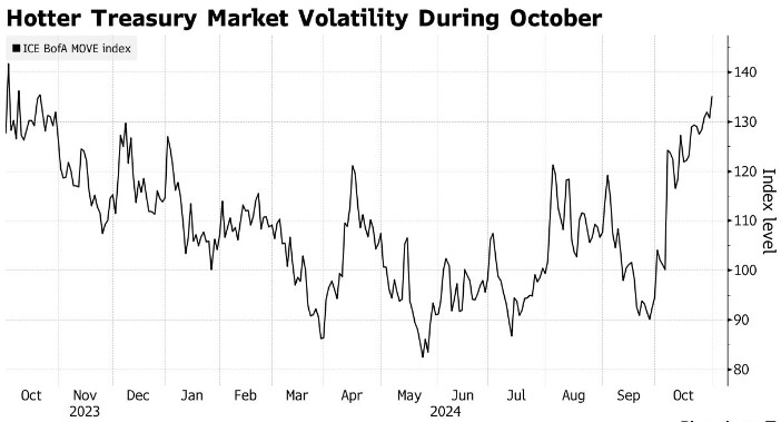 过去一个月公债抛售推高美债收益率约60个基点,部分原因是9月就业数据意外强劲。自那以后,由于美国大选日临近以及美联储政策路径的不确定性,市场波动性有所上升。受到密切关注的衡量美国债券市场波动性的ICE-BofA波动指数(ICE-BofA Move Index)本周收于今年最高水平,表明交易员正在支付更高的价格,以防范日益加剧的动荡。周四一笔引人注目的交易包括通过与有担保隔夜融资利率挂钩的期权获得1000万美元的长期波动溢价。