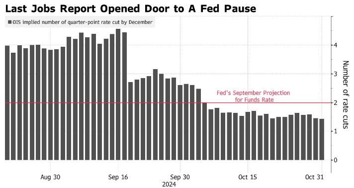 Janus Henderson Investors美国固定收益主管Greg Wilensky表示,尽管10月份的非农就业报告不太可能改变人们对美联储11月份决定的预期,但该数据仍可能“影响市场对未来会议降息路径的预期”。交易员将关注失业率,经济学家预计失业率将稳定在4.1%。强劲的数据有可能支撑债券市场对明年初可能暂停降息的预期。