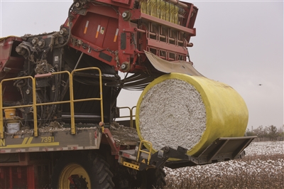 10月24日,在新疆阿克苏地区阿瓦提县一处棉田,大型采棉机卸下自动打包好的棉花。金秋十月,阿瓦提县的长绒棉进入采摘季,大型采棉机来回穿梭,雪白的棉花被快速采摘、打包、装车,现场一派繁忙的景象。得益于高标准农田建设,当地棉花实现从春播到采收全过程机械化作业。阿瓦提县植棉历史悠久,这里种植的长绒棉因其纤维柔长、细腻柔软、韧性强等特性,备受消费者青睐。