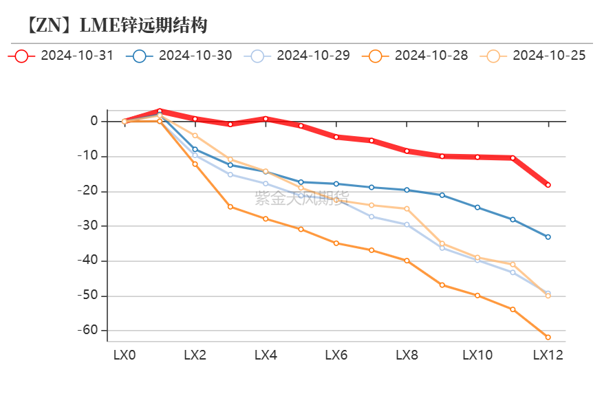 结构上看,内盘维持back结构,外盘多头头寸及仓单集中度显著开始下行,由contango转为back;但LME锌0-3升水走弱至2美金附近。