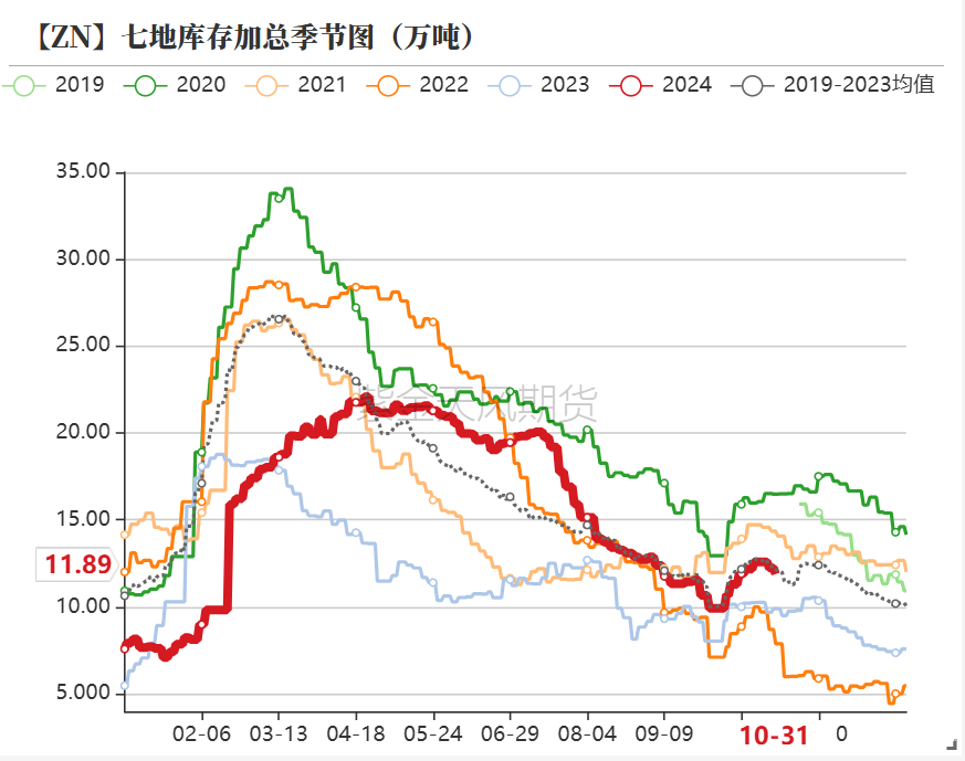 截至本周四七地锌锭库存总量为11.89万吨,同比减少0.70万吨。上海地区库存小幅录减,周内仓库到货较少,下游企业维持刚需采购。整体来看,原三地库存降低0.78万吨,七地库存降低0.70万吨。