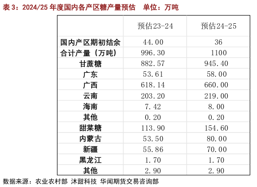 沐甜科技数据显示,新疆24/25制糖期糖产量预估上调至80万吨,之前是70万吨左右。相关数据显示,近20年来,新疆糖产量最高在06/07制糖期达到70.82万吨,其他制糖期均没有超过61万吨。沐甜科技预计24/25制糖期内蒙糖产量维持70万吨左右。根据农业农村部、沐甜科技数据推算,2024/25年度国内产量将达到1100万吨,同比增加104万吨。
