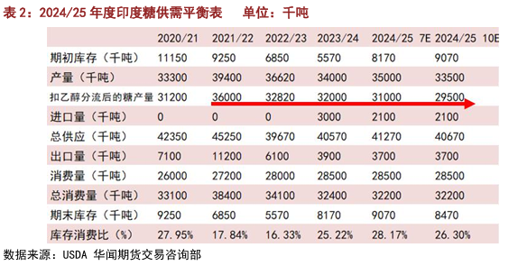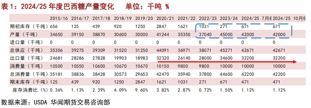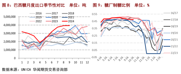 虽然巴西甘蔗产区经历的灾害冲击,但巴西年度糖产量及出口数据依然不低。据美国农业部USDA10月的供需报告显示,2024/25年度巴西糖产量预期同比下滑300万吨,达到4200万吨。从历史角度看2024/25年度巴西产量是历史第二高。巴西年度预期出口量仍达到3220万吨,同样属于历史高位。