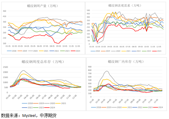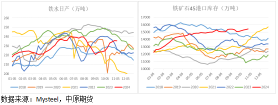 原料端基本面结构来看,目前铁矿石港口高库存仍是影响四季度铁矿上涨空间的最大制约。双焦方面,焦煤库存压力大于焦炭。焦化厂焦煤库存自9月开始抬升,整体仍低于2023年同期5%左右,但港口焦煤库存量偏高,与今年蒙煤通关增加有关,截止10月25日,港口炼焦煤库存416.66万吨,同比2023年高出103%。焦炭基本面相对乐观,整体库存水平偏低,价格主要跟随成材波动。