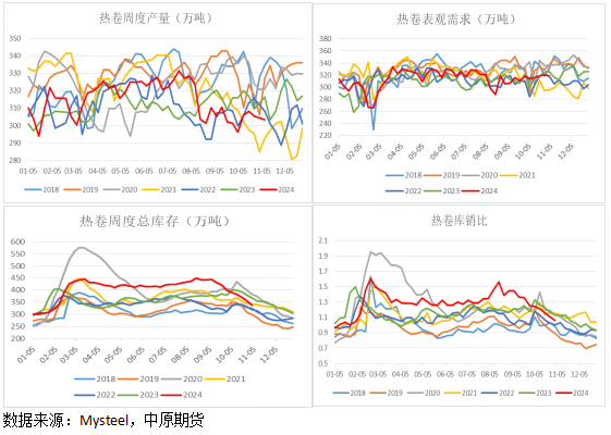 周度五大材产需双降,整体减产明显,与近期钢厂利润收缩有关。分品种来看,减产主要集中在螺纹钢,周度产量环比下降7.93万吨至243.22万吨,表观需求环比下降2.82万吨至240.68万吨。总库存小幅增加2.54万吨,但依然较2023年同期减少24.39%;其中社库增加3.83万吨,较2023年同期下降29.64%;前期累库的厂库端本周转降1.29万吨,较去年同期下降12.44%。整体库存矛盾不大,螺纹钢减产缓解了进一步累库的压力。热卷方面,基本面继续改善。其中,产量周减1.10万吨至303.29万吨,表观需求下降1.36万吨至318.70万吨,总库存继续去化15.41万吨,较2023年同期下降8%。目前去库集中在社会库存,环比下降14.33万吨,钢厂端库存下降1.08万吨。库销比继续下降至1.06,当前热卷需求表现略超季节性,存在较强的韧性,与下游制造业阶段性补库有关。