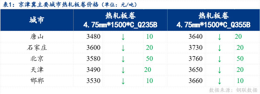今日全国主要城市热轧板卷4.75mm普卷均价3581元/吨,较上一交易日下跌17元/吨。今日京津冀热轧板卷现货下跌,成交不一。原料方面,今日唐山迁安方坯资源出厂含税报3140元/吨,较上一交易日下调30元/吨。