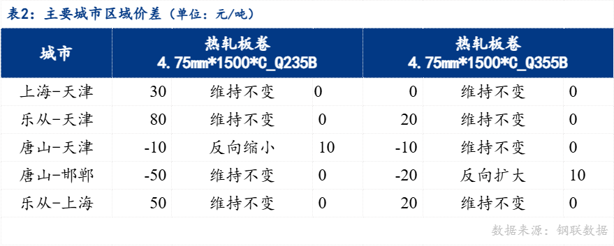 从区域价差来看,4.75mm普卷华南与华北价差80元/吨,华东与华北价差30元/吨,华南与华东价差50元/吨。京津冀地区价差来看,唐山与天津价差-10元/吨,唐山与邯郸价差-50元/吨 。