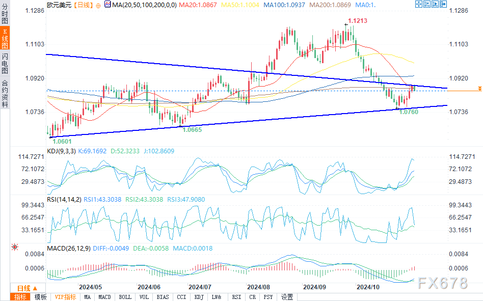 反弹背后的另一个因素是欧元/美元在10月初开始出现明显的看跌逆转后的短期超卖状况,在考虑测试长期上行趋势支撑之后,价格出现反弹。