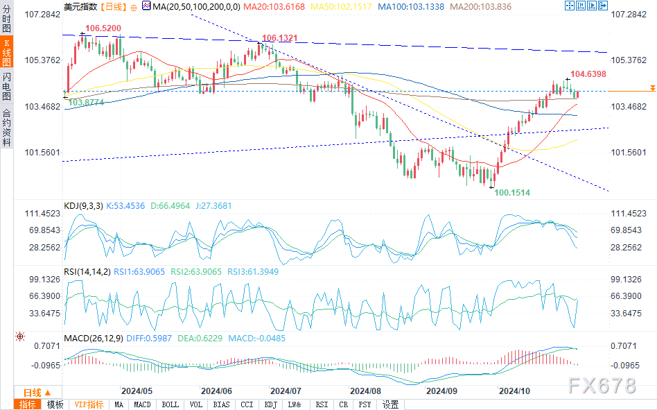 汇通财经APP讯——周五(11月1日)欧盘时段,美元指数报104.1447,涨幅0.24%。上个月美元指数上涨3.1%,是自2022年9月以来的最大涨幅。以下是对美元指数和欧元/美元的分析。