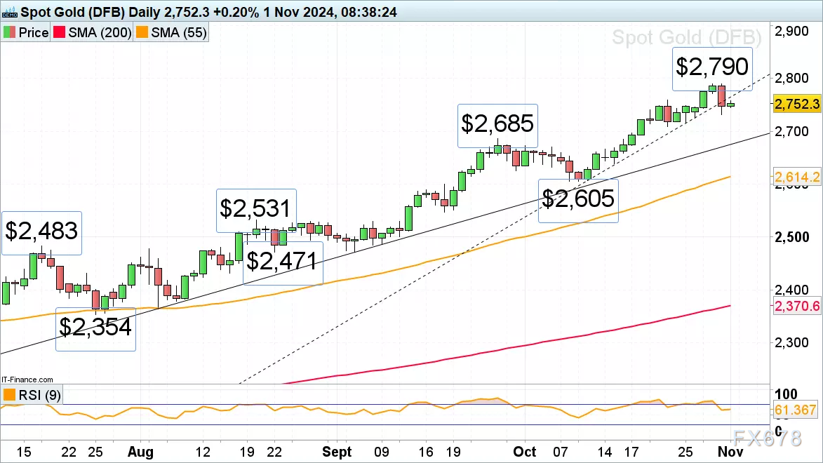 现货金价创下每盎司2790美元的历史新高,接近2800美元的心理关口,随后回落至2732.00美元,原因是一些交易员在周五美国非农就业数据公布和下周美国总统大选之前套现获利。