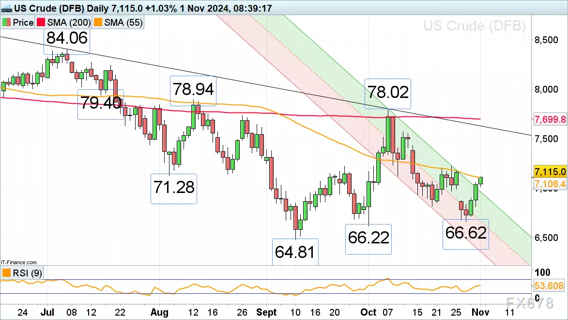 最近西德克萨斯中质原油(WTI)近月期货价格大幅下跌至周二的低点66.62,随后由于中东局势升级而迅速反弹近6%。对伊朗和以色列之间的紧张局势以及可能出现的供应中断的担忧,已将油价推高至55日简单移动平均线(SMA)71.08,上周的高点72.29是阻力位。如果突破,底部将形成,10月78.02的峰值将再次出现。