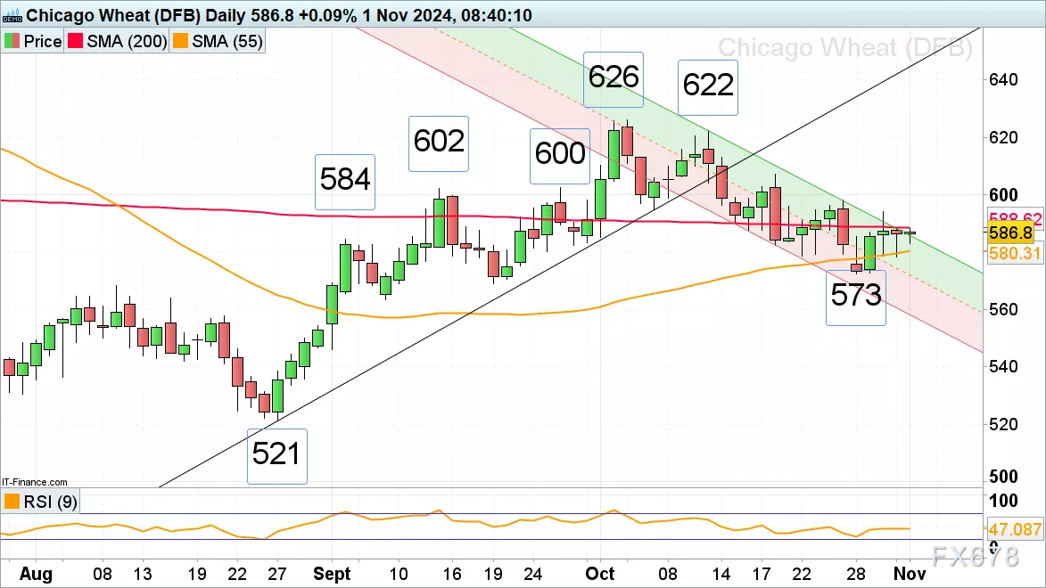 美国小麦期货价格已从周一573点的低点反弹,过去三天一直在测试10月下行通道阻力线和586-589之间的200日移动均线。