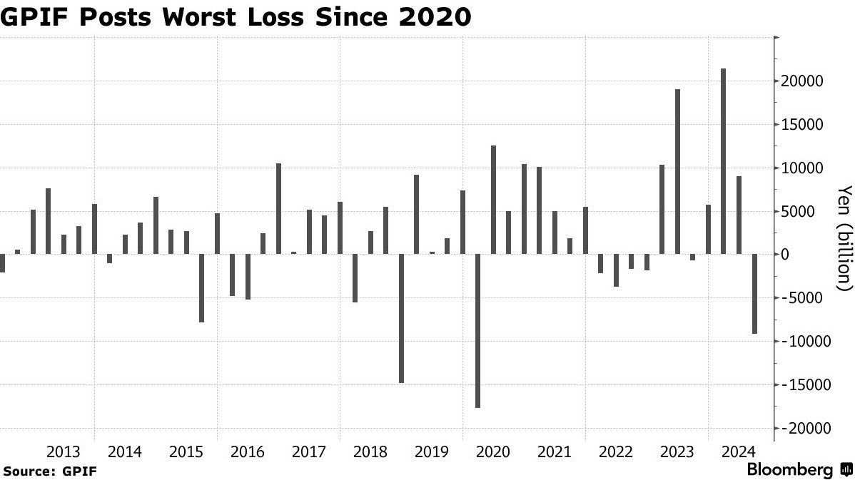 日本政府养老金投资基金(GPIF)在2024年第三季度遭遇了自2020年以来的最大亏损,主要由于日元反弹导致海外证券收益减少以及日本股市下跌。作为全球最大的国家养老基金之一,GPIF在其四大资产类别中的三项——外国股票和债券以及日本股票——均录得亏损,仅国内债务实现了正收益。这一亏损情况可能会减少市场对GPIF在明年制定新投资组合模型时增加股票持有量以提升整体收益的预期。
