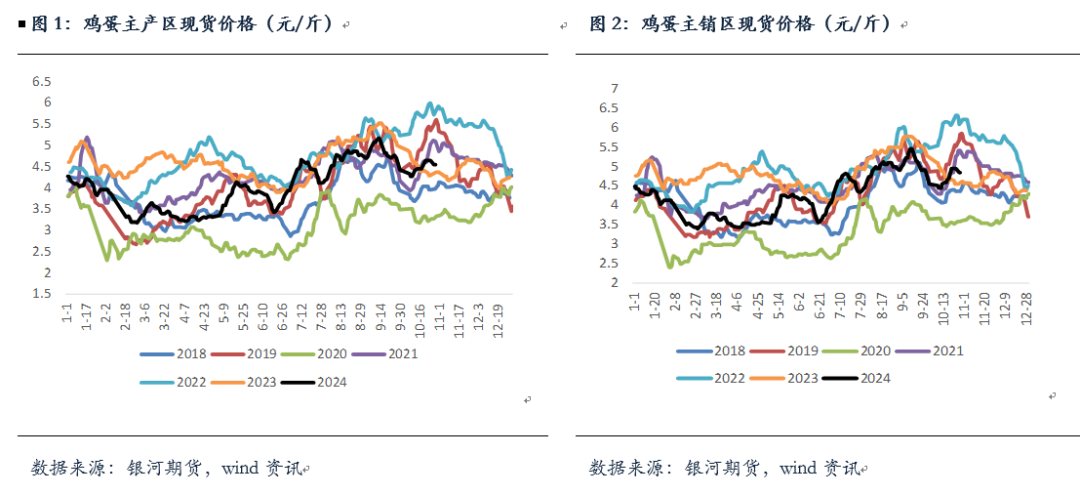 现货方面:10月鸡蛋现货价格受需求端影响价格先涨后跌。国庆节市场消化库存为主价格持续走弱,之后各环节陆续补库消费情况再次好转。主产区价格节后回落至4.27元/斤后价格有所回升,最高涨至4.55元/斤后有企稳迹象;主销区节后回落至4.44元/斤后最高涨至4.94元/斤附近。