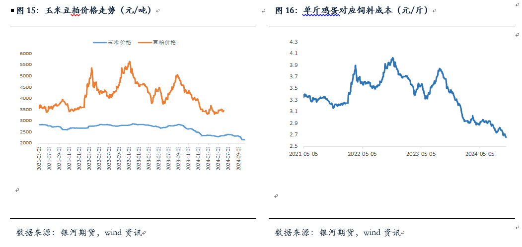 10月饲料成本略有下降。当月玉米价格较9月相比下跌40元/吨至2245元/吨;豆粕价格近期较9月相比下跌90元/吨至3000元/吨。当前综合饲料成本约在2470元/吨附近对应一斤鸡蛋的饲料成本2.7元/斤附近,较9月相比略有下跌,预计短期饲料成本大概率维持当前水平震荡。