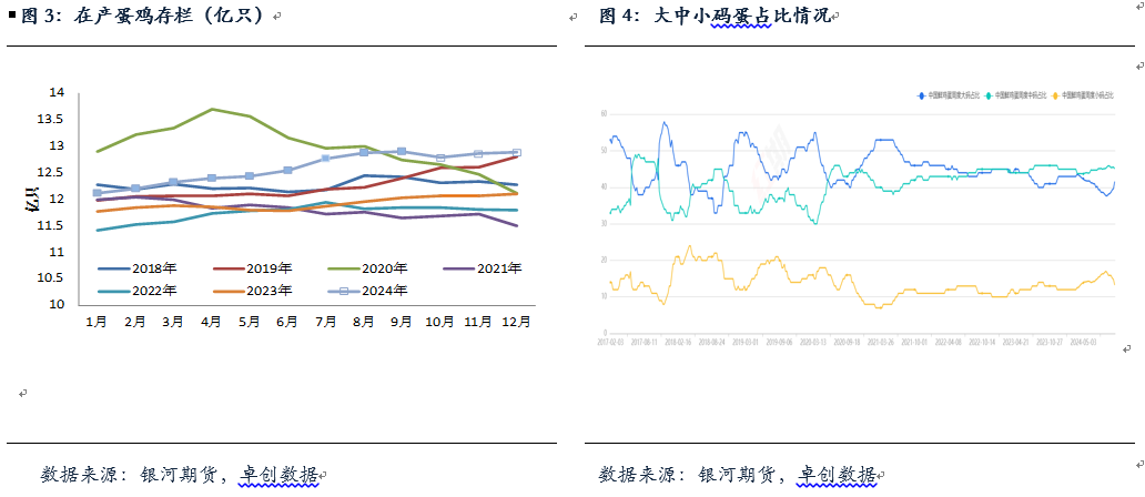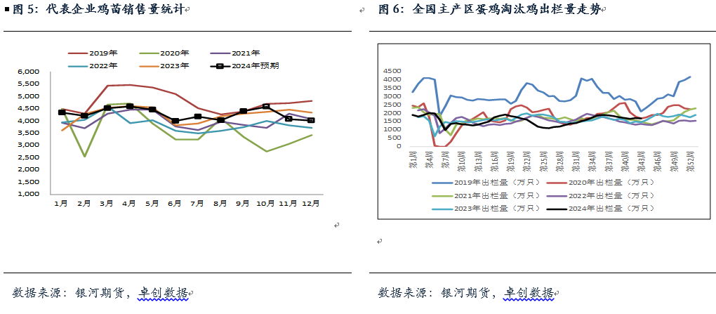 根据卓创数据9月份全国在产蛋鸡存栏量为12.9亿只,较上月增加0.02亿只,同比增加7.2%,高于之前预期。9月份卓创资讯监测的样本企业蛋鸡苗月度出苗量(约占全国50%)为4564万羽,环比增加3.8%;同比增加4.6%,不考虑延海和集中淘汰的情况下,根据之前的补栏数据可推测出2024年10月、11月12月、1月在产蛋鸡存栏大致的数量为12.79亿只、12.86亿只、12.89亿只、12.93亿只。