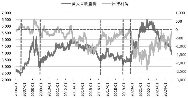 图为黄大豆1号收盘价与盘面压榨利润(单位:元/吨)