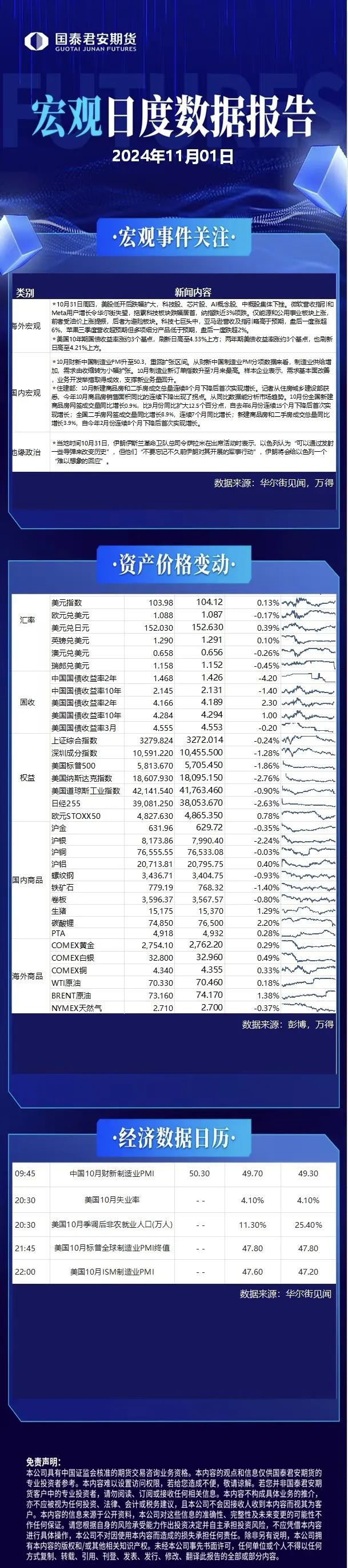 从宏观基本面看,上周就业数据大幅波动、分化。正如我们前期观察到的非经济因素影响下(大选时段政府部分扩大招工、飓风影响等)使得月度就业数据波动较大。其中非农月度增幅仅仅1.2万,家庭调查月度新增收缩36万+。Helene和Milton飓风、波音公司罢工对数据有显著影响,但除此之外,相比更容易受到天气影响的餐饮休闲行业,制造业、专业服务领域在10月份大幅减员使得其经济周期性因素难以忽视,本月政府招聘仍是较大增量贡献。结合就业数据和前期通胀数据,本周美联储议息会议预计仍将降息25bp,市场预期接近,无明显预期差。(戴璐)