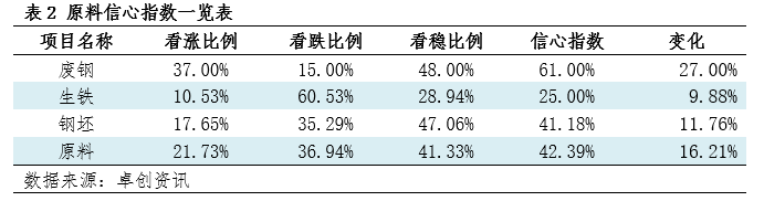 分品种来看,废钢信心指数为61,较上期增加27;生铁信心指数为25,较上期增9.88;钢坯信心指数为41.18,较上期增11.76。