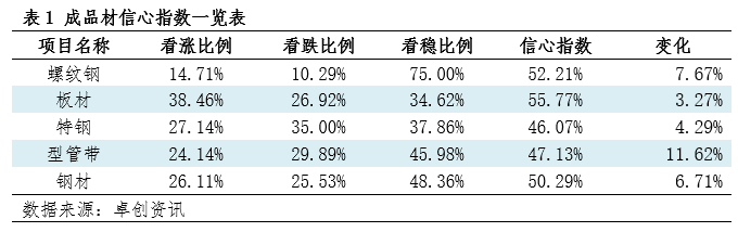 分品种来看,螺纹钢信心指数为52.21,较上期指数增7.67;板材信心指数为55.77,较上期指数增3.27;特钢信心指数为46.07,较上期指数增4.29;型管带信心指数为47.13,较上期增11.62。