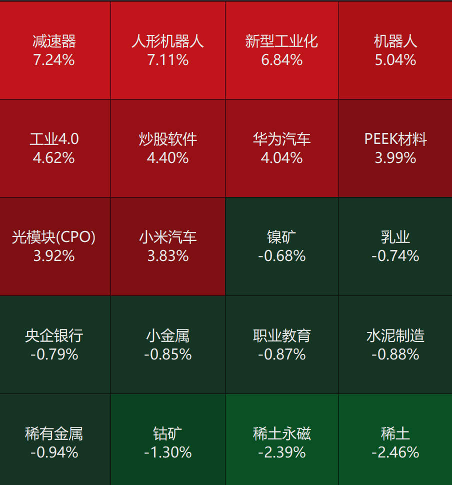 盘面上,人形机器人、新能源汽车概念领涨,多只个股涨停并创新高,爱施德、阳谷华泰、豪能股份、旺成科技、赛力斯股价创历史新高。三季度业绩回暖的证券、电气设备、半导体等板块也涨幅居前。