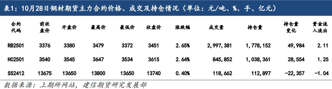 从中长期来看,钢材市场相对乐观,一方面,通过对比表需数据,虽然钢材需求环比下降,但同比降幅持续收窄,这有助于提升需求端对价格的支撑;另一方面,黑色产业链上游的商品铁矿石价格逐步企稳回升,带动钢材价格的回升;同时,一揽子政策的稳步发力,叠加11月上旬明年预算调整预期,给予黑色系向好支撑;通过观察长、短流程钢厂现货吨钢毛利可以看出,目前利润较9月底、10月初大幅回落,因此钢厂继续扩产的几率有所下降,供需结构有望回归平衡。预计螺纹钢、热卷期货主力2501合约短期将延续震荡偏强运行。