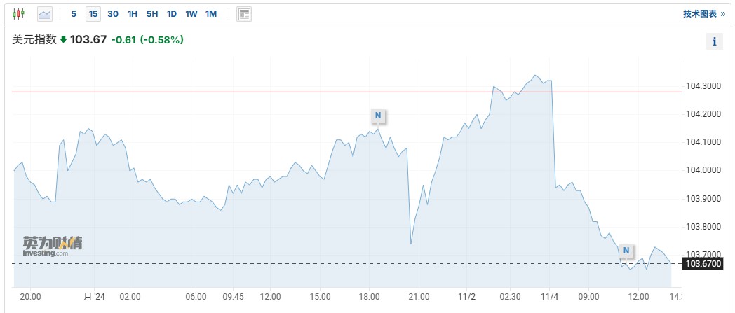 美元周一走低,原因是投资者准备迎接本周美国总统大选结果可能为全球经济带来的转折点、以及美联储可能再次降息对债券收益率产生重大影响。截至发稿,美元指数跌0.58%,报103.67。