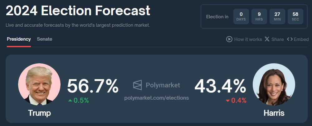 与此同时,据在线预测平台Polymarket的最新数据,截至发稿,押注特朗普赢得今年美国总统大选的比率为56.7%,押注哈里斯胜选的比率为43.4%。