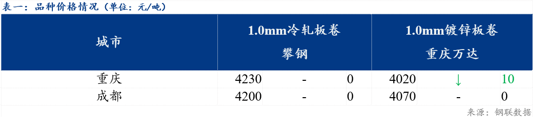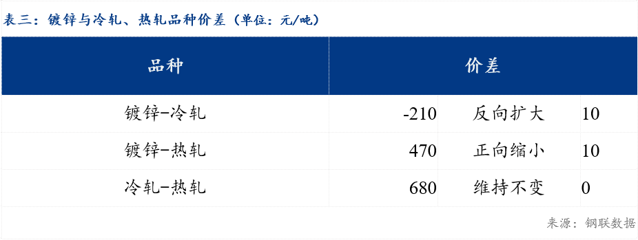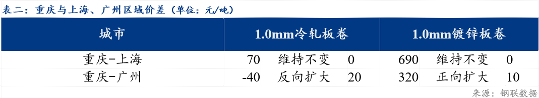 重庆、上海地区冷轧板卷区域价差维持不变,重庆、广州冷轧板卷区域价差反向扩大20元/吨;重庆、上海镀锌板卷区域价差维持不变,重庆、广州镀锌板卷区域价差扩大10元/吨。镀锌、冷轧品种价差反向扩大10元/吨;镀锌、热轧品种价差缩小10元/吨;冷轧、热轧品种价差维持不变。