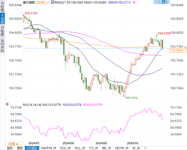 最新数据显示,美元指数下跌0.63%,报103.6541,反映出市场对未来美联储降息的预期影响力正在加大。美元近期的走弱一方面受到美国大选不确定性的影响,另一方面则是市场预期美联储将在12月再次降息。知名机构预计本周降息25个基点至4.50%-4.75%的可能性已达100%,而未来几个月或将再度降息以应对经济下行压力。