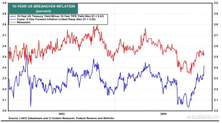 “这种预期的上升是由于对新一届政府可能出现更多财政超支的担忧所致,”Yardeni提到,并在报告中展示了债券市场对通胀的衡量数据。