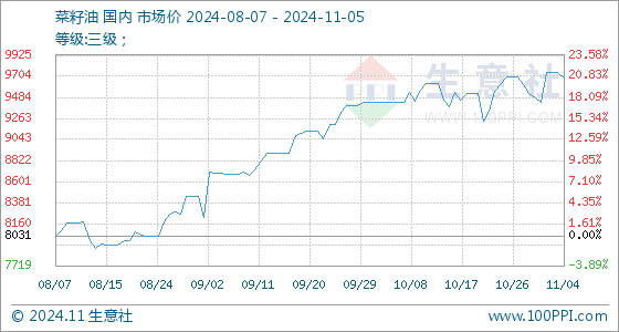 11月5日生意社菜籽油基准价为9683.33元/吨