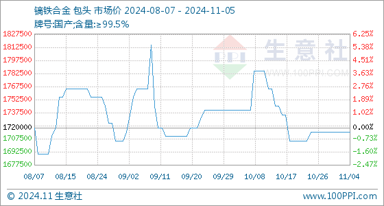 11月5日,生意社镝铁合金基准价为1715000.00元/吨,与本月初持平。