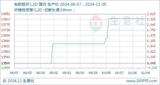 11月5日,生意社粘胶短纤1.2D基准价为13820.00元/吨,与本月初持平。